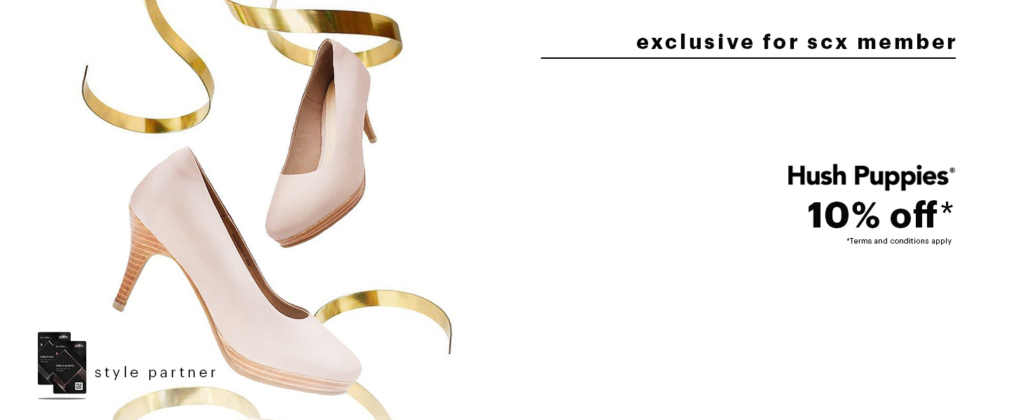 Show your SCX E-Card and enjoy 10% off* at Hush Puppies.