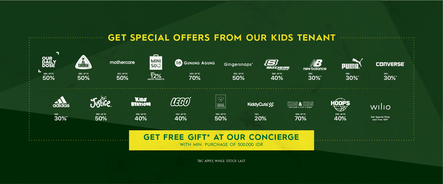 Adidas, Justice, Kidz Station, Lego, Teddy House, KiddyCuts, Kids & Kids, Hoops, Wilio, Gingersnaps, New Balance, Puma, Converse, Our Daily Dose, ELC, Mothercare, Miniso Sketcher, and Gunung Agung.