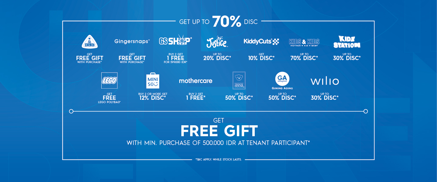 Get Special Offers UP TO 70%* from our KIDS Brands and get FREE Gift* with min. spend of 500,000 IDR at our KIDS Brands participant.