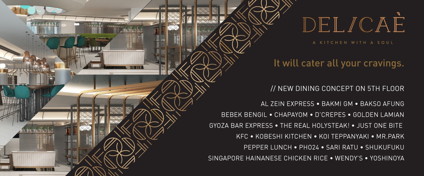 AL ZEIN • BAKMI GM • BAKSO AFUNG • BEBEK BENGIL • CHAPAYOM • D'CREPES • GOLDEN CENTURY • GYOZA EXPRESS • HOLYSTEAK! • JUST ONE BITE • KFC • KOI TEPPANYAKI • MR. PARK • PEPPER LUNCH • PHO24 • SARI RATU • SHUKUFUKU • KOBESHI EXPRESS • SINGAPORE CHICKEN RICE • WENDY'S • YOSHINOYA.