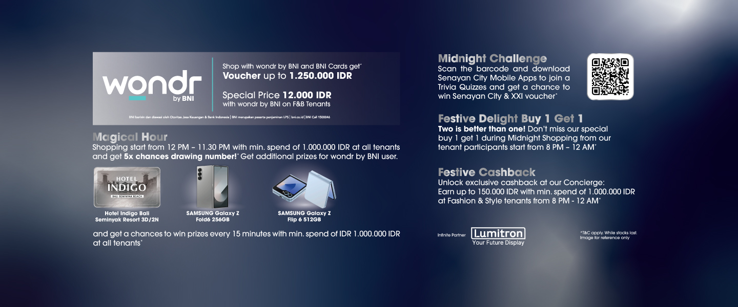Shopping start from 12 PM - 11.30 PM with min. spend of 1.000.000 IDR at all tenants and get 5x chances drawing number!* Get additional prizes for wondr by BNI user.