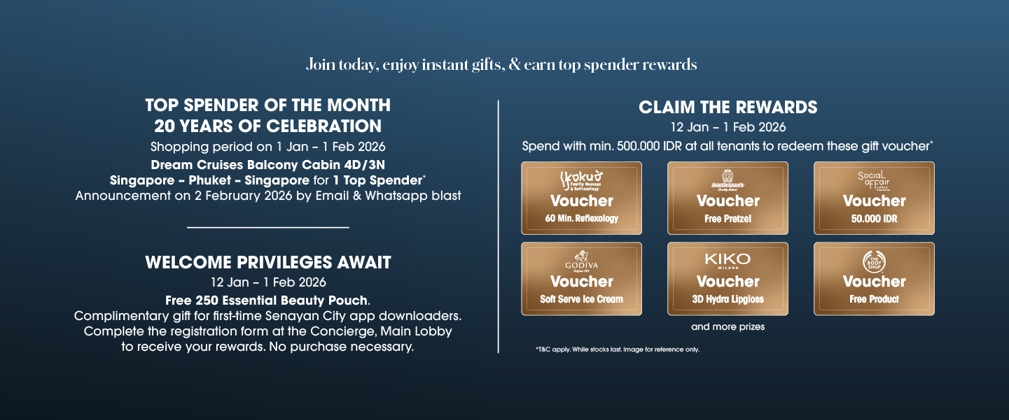 - Top Spender akan dipilih oleh management dan akan diumumkan pada tanggal 2 Februari 2026 melalui Email Blast, WA Blast, dan push notification mobile app Senayan City.