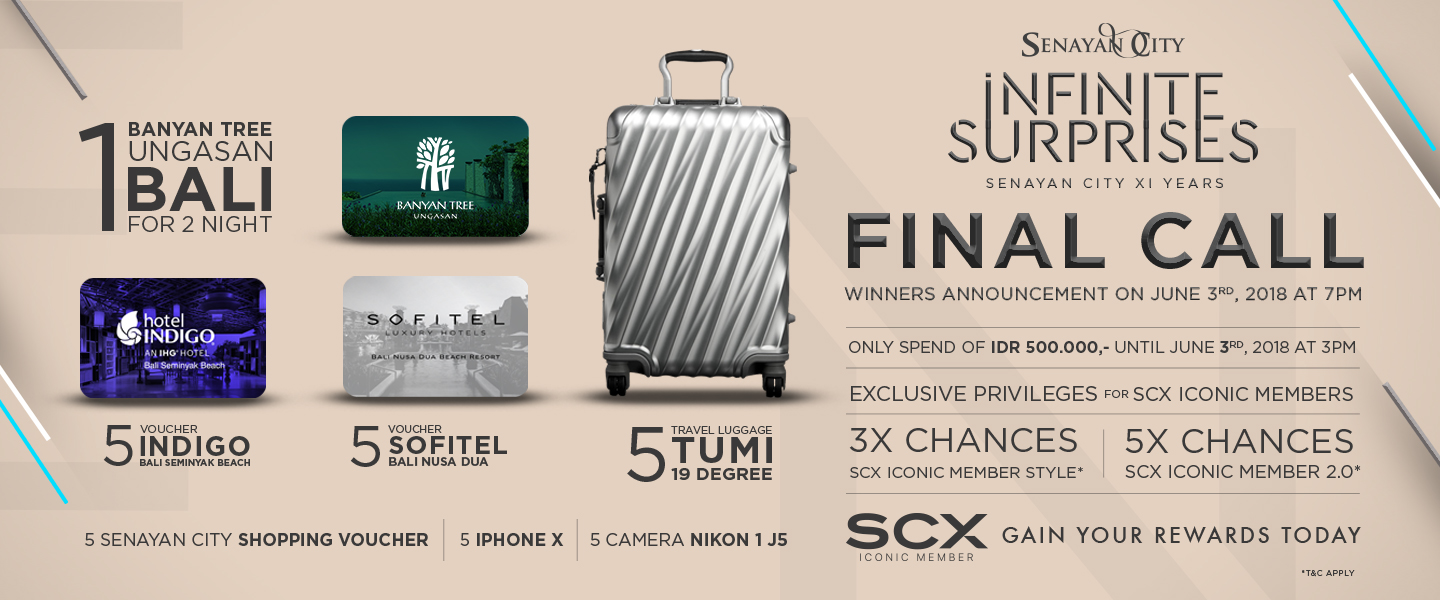 - SCX iconic Member atau Customer berhak mendapatkan 1 nomor kupon undian dengan minimal pembelanjaan sebesar Rp. 500.000,- dalam satu struk. Khusus All F&B tenant cukup berbelanja minimal Rp.250.000 dalam satu struk.