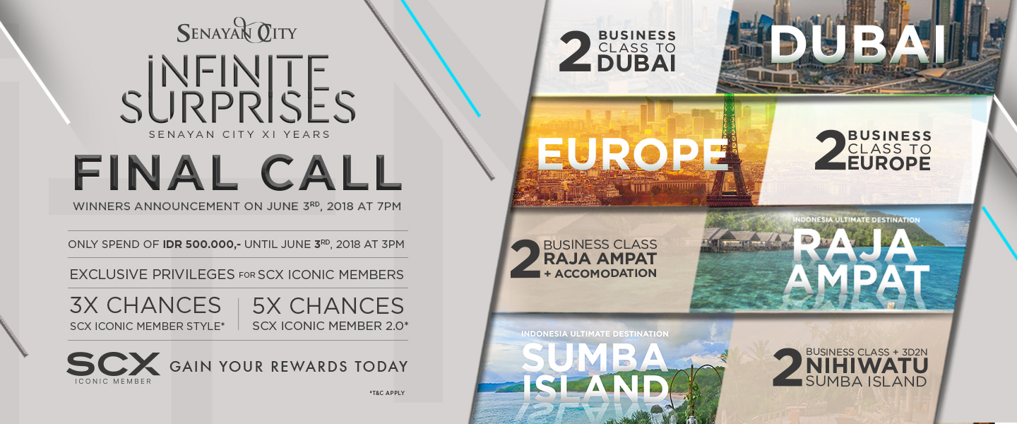 - Manajemen Senayan City berhak untuk membatalkan kemenangan, apabila didapati / ditemukan kecurangan dalam bentuk apapun.