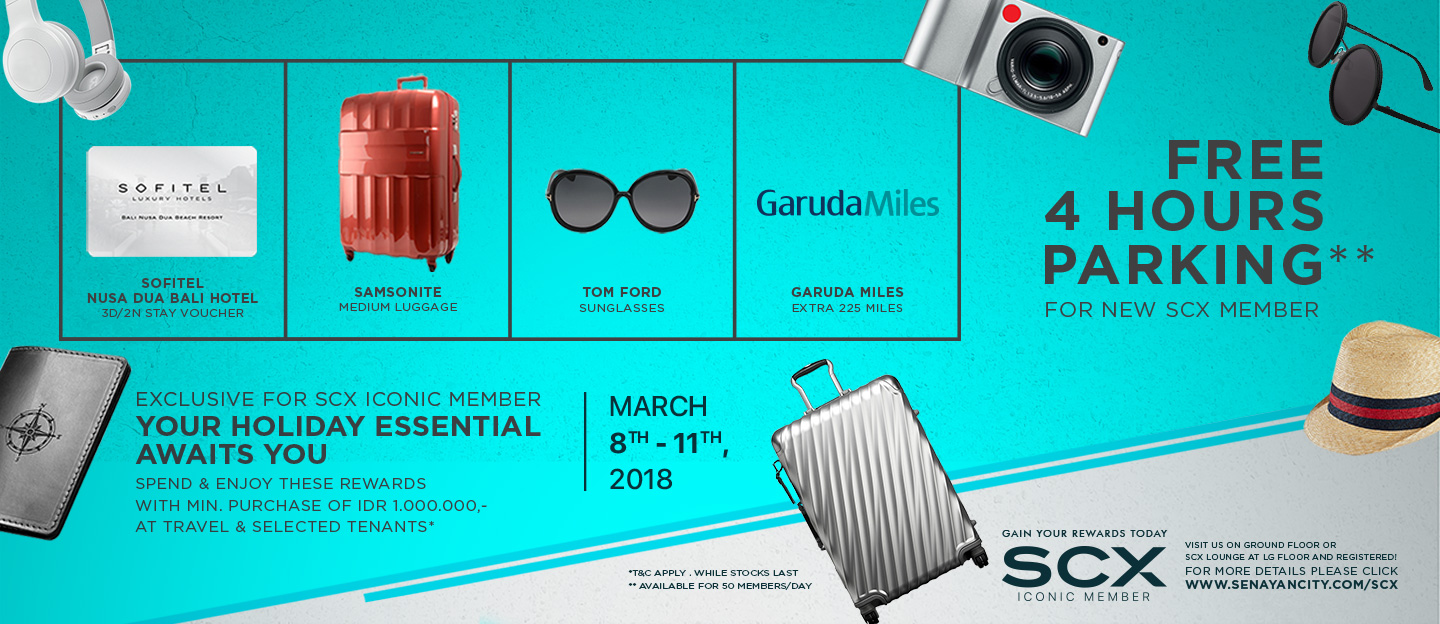 4. 200 SCX existing member pertama yang mendaftarkan struk pembelanjaan di tenant travel & essentials selama periode program dengan minimal senilai Rp 1.000.000,- (satu juta rupiah) berhak mendapatkan instant rewards berupa: