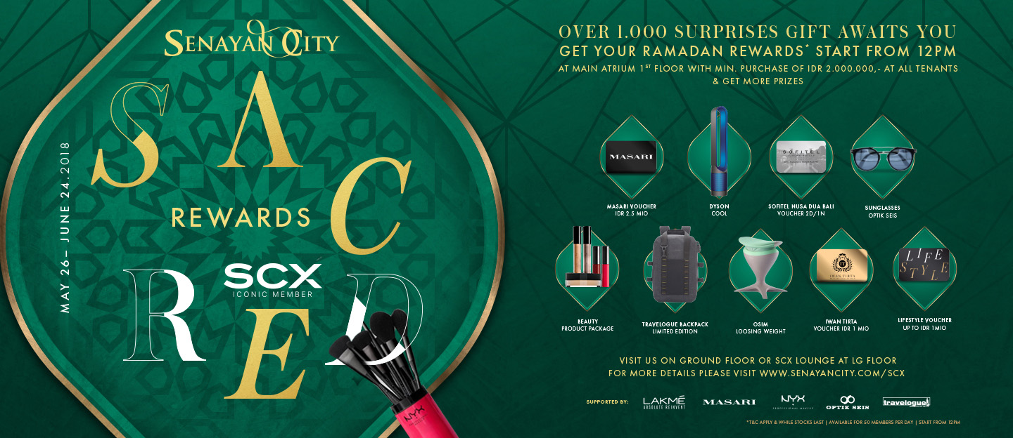 Reward yourself on this holy month of Ramadan with special prizes from us like everyday* from May 26 - June 24, 2018 with min. spend of IDR 2 mio at Senayan City.