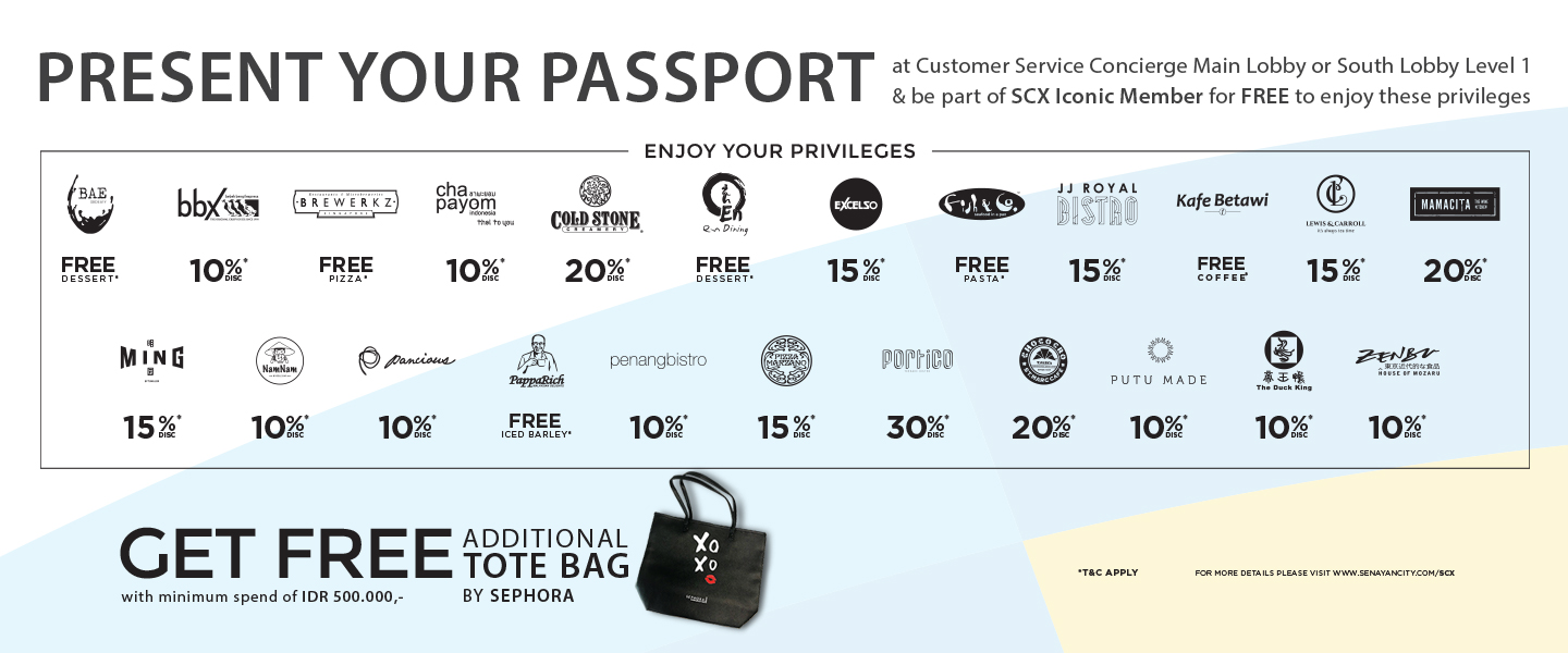 Exclusive for Tourist Privileges only by present your passport at Customer Service Concierge Main Lobby or South Lobby Level Ground and be part of SCX Iconic Member for FREE to enjoy these privileges