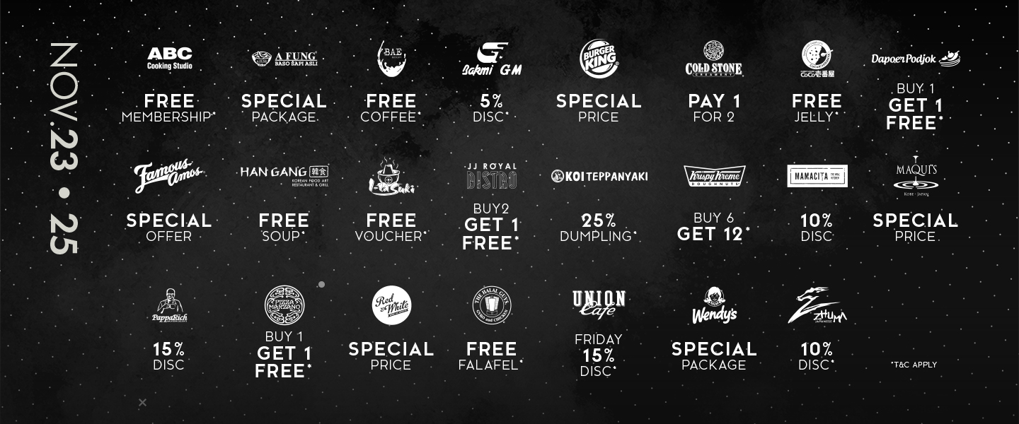 ABC Cooking | BAE Socieaty | Burger King | Coldstone | Dapoer Podjok | Famous Amos | JJ Royal Bistro | Krispy Kreme | Mamacita | Papparich | Pizza Marzano | Union Cafe | Zhuma | etc