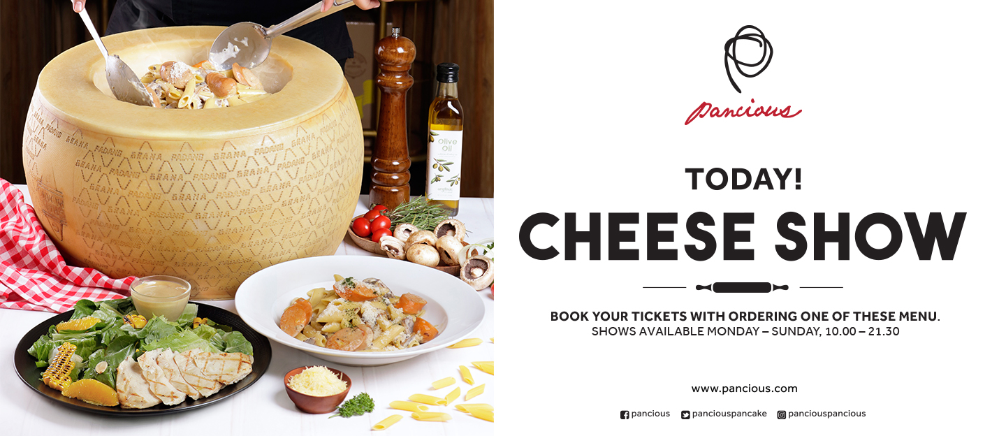 Cheese Wheel menu is now available at Pancious Senayan City level 5. Book your Cheese Show of our pasta and sausages tossed in a giant Grana Padano Cheese. Available salad option with greens with oranges, grilled chicken and almonds tossed in Grana Padano Cheese.