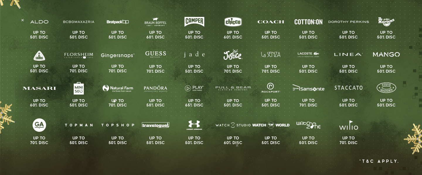 From these iconic stores: Aldo | BCBG Maxazria | Bratpack | Braun Buffel | Camper | Chicco | Coach | Cotton On | Dorothy Perkins | Dr. Martens | Jade | Lacoste | Mango | Masari | Miniso | and many more.