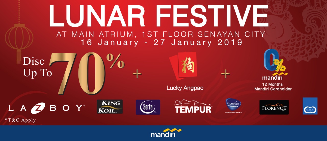 Discover Home & Living Lunar Festive Exhibition at Senayan City Main Atrium, 1st Floor. And get disc UP TO 70%+Lucky Angpao + 0% Mandiri Installment. T&C Apply