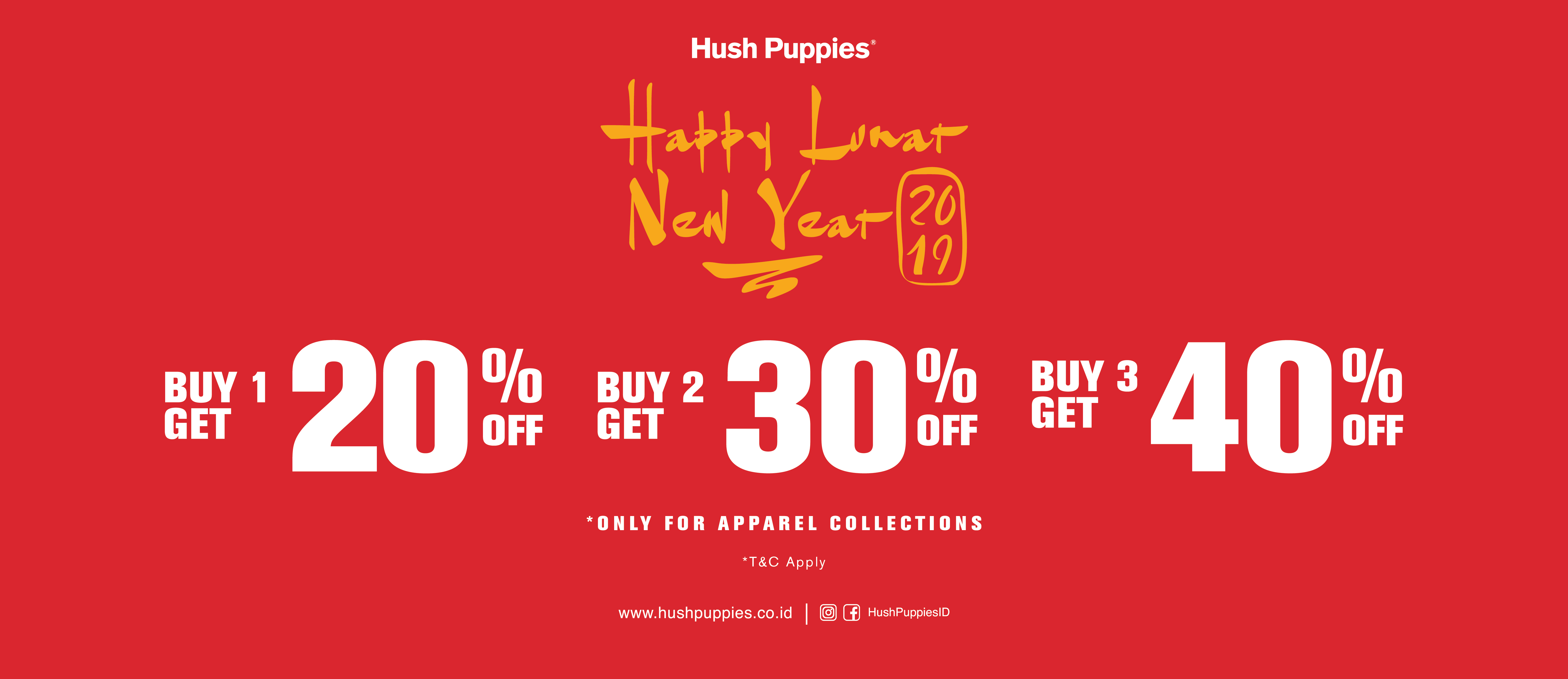 Hush Puppies Lovers, dapatkan promo discount up to 40% untuk setiap pembelian product apparel di Hush Puppies. Periode promo mulai 18 Januari sampai 05 Februari 2019. Celebrate Chinese New Year with Hush Puppies!