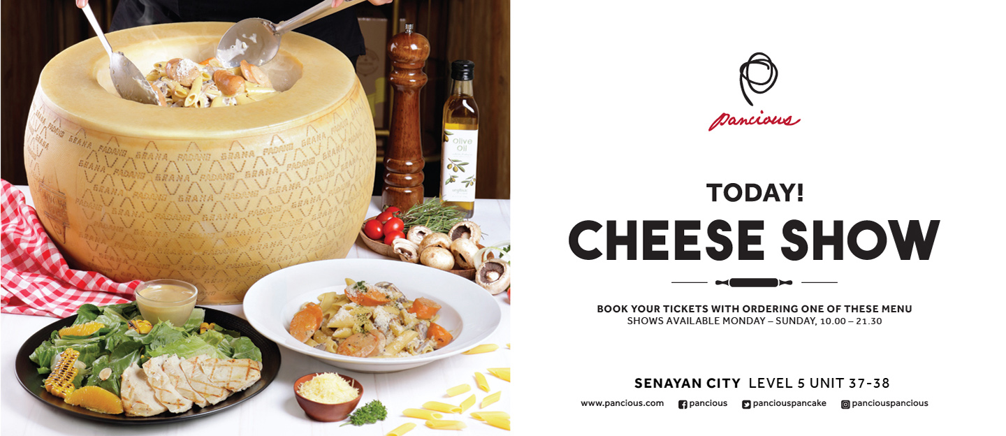 Cheese Wheel menu is now available at Pancious Senayan City level 5. Book your Cheese Show of our pasta and sausages tossed in a giant Grana Padano Cheese. Available salad option with greens with oranges, grilled chicken and almonds tossed in Grana Padano Cheese.