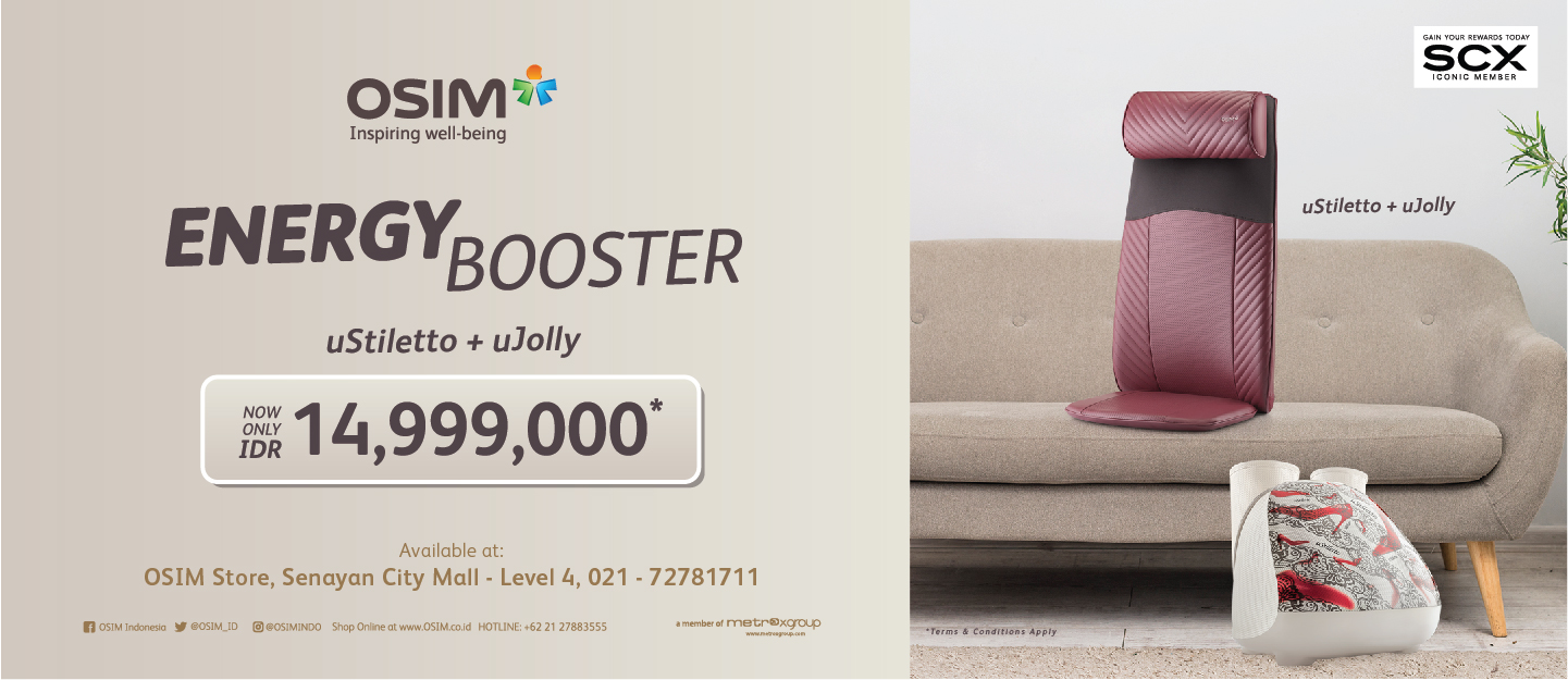 BOOSTER TIME!! Welcoming OSIM Energy Booster Package with special price IDR 14.999.000,-. More info visit OSIM Store Senayan City Level 4 or call 021-72781711. T&C Apply