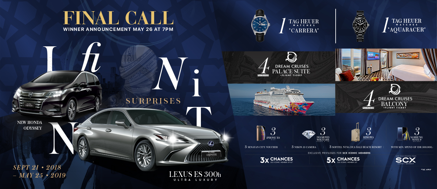- Khusus SCX card holder berkesempatan mendapatkan 3x nomor undian untuk pemegang kartu SCX Style (silver) dan 5x kesempatan nomor undian untuk pemegang kartu SCX 2.0 (rose gold).