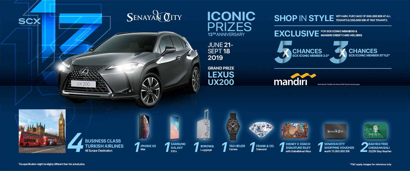 - SCX iconic Member atau Customer berhak mendapatkan 1 nomor kupon undian dengan minimal pembelanjaan sebesar Rp. 500.000,- dalam satu struk. Khusus All F&B tenant cukup berbelanja minimal Rp.250.000 dalam satu struk.