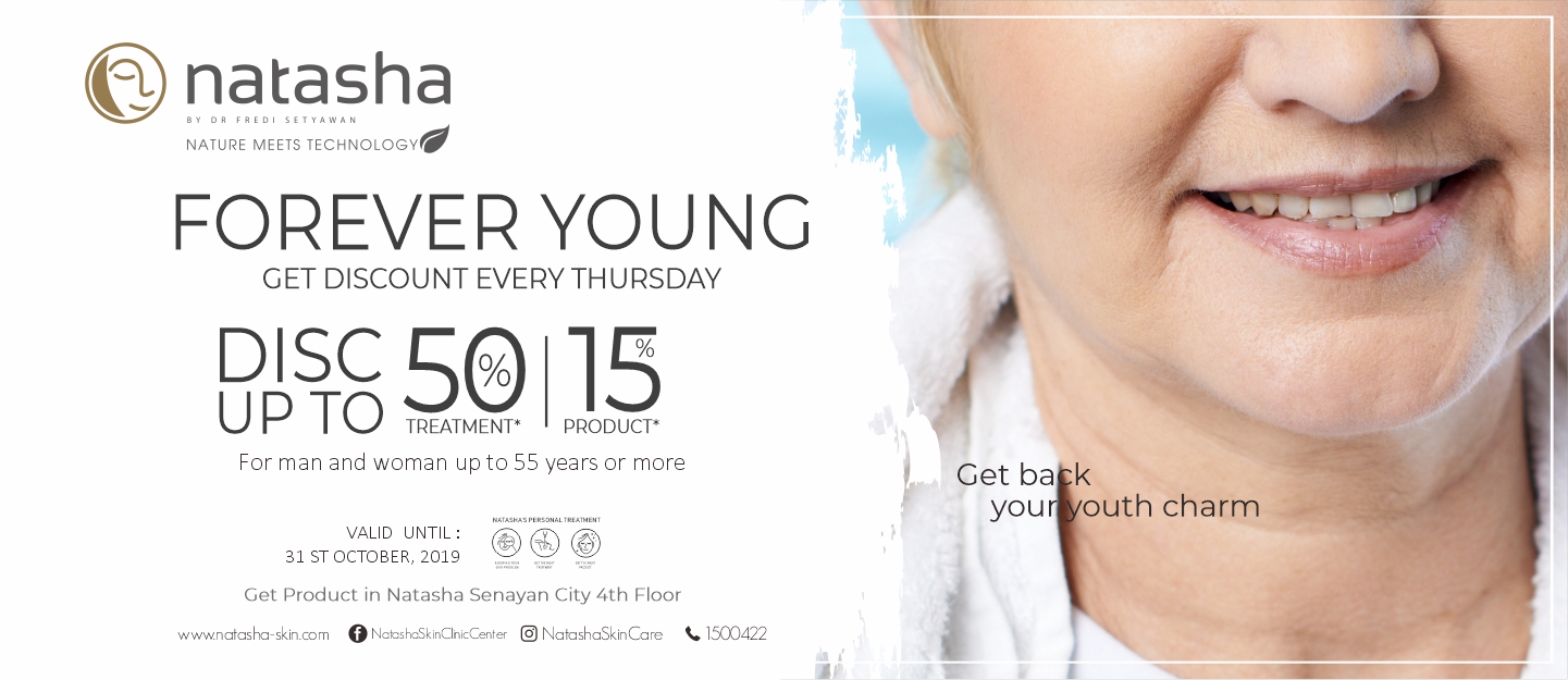 As we get older, our skin needs to be treated to keep skin healthy and look younger. Natasha Senayan City gives special discount for patients above 55 years old. Get up to 50% off for treatment and 15% off for products. #ForeverYoung #Natashaskincare