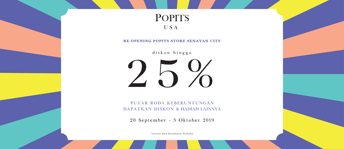 Yuk mampir ke store Popits di Senayan City dan ikutan “Spin The Wheel”! Cukup belanja minimal Rp 699.000 dan dapatkan satu kali kesempatan untuk memutar roda keberuntungan. Bisa dapetin DISKON sampai 25% lho! Promo berlaku mulai 20 SEPT- 3 OKT 2019