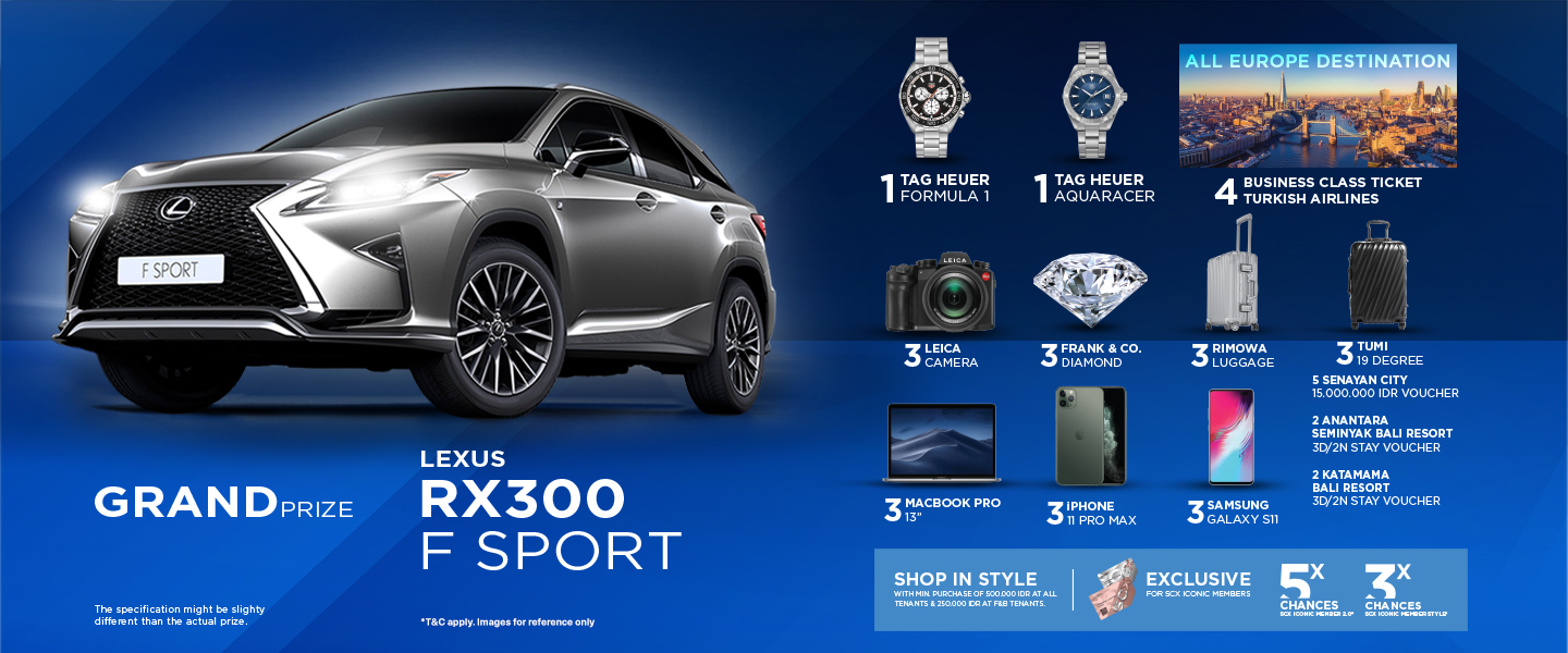 - SCX iconic Member atau Customer berhak mendapatkan 1 nomor kupon undian dengan minimal pembelanjaan sebesar Rp. 500.000,- dalam satu struk. Khusus All F&B tenant cukup berbelanja minimal Rp.250.000 dalam satu struk.
