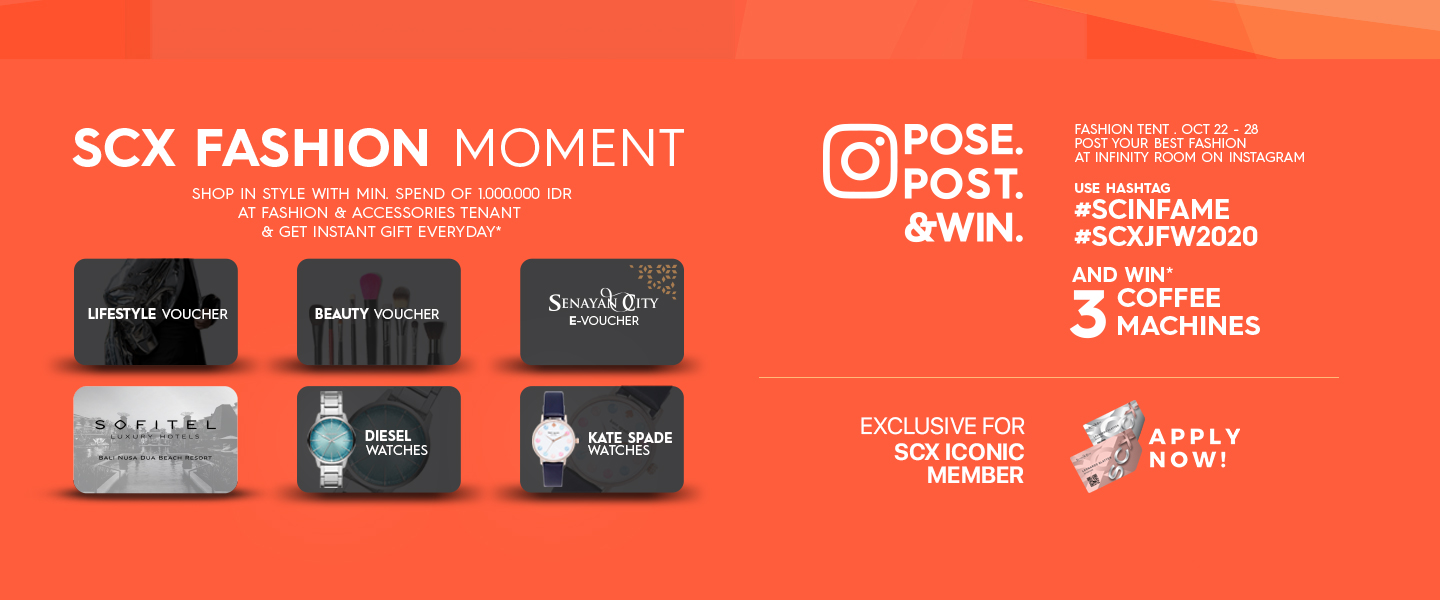 3. 30 SCX Member pertama yang menukarkan struk pembelanjaan khusus di tenant fashion, style, dan aksesoris pada tanggal 22 – 28 Oktober 2019 selama periode berlangsung dengan minimal senilai Rp1.000.000,- (satu juta rupiah) berkesempatan mendapatkan hadiah sesuai sistem.