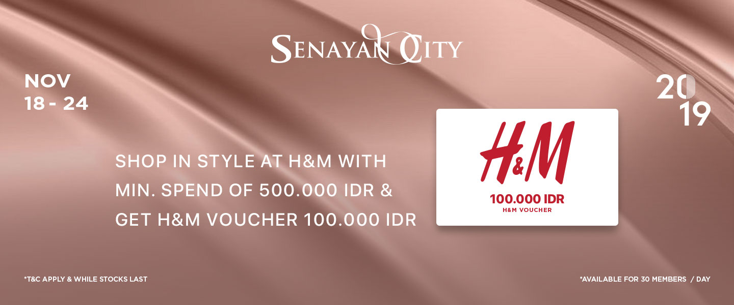 Shop in style at H&M with min. spend of 500.000 IDR and get H&M voucher 100.000 IDR at our Lounge, concierge at Main, South & North Lobby