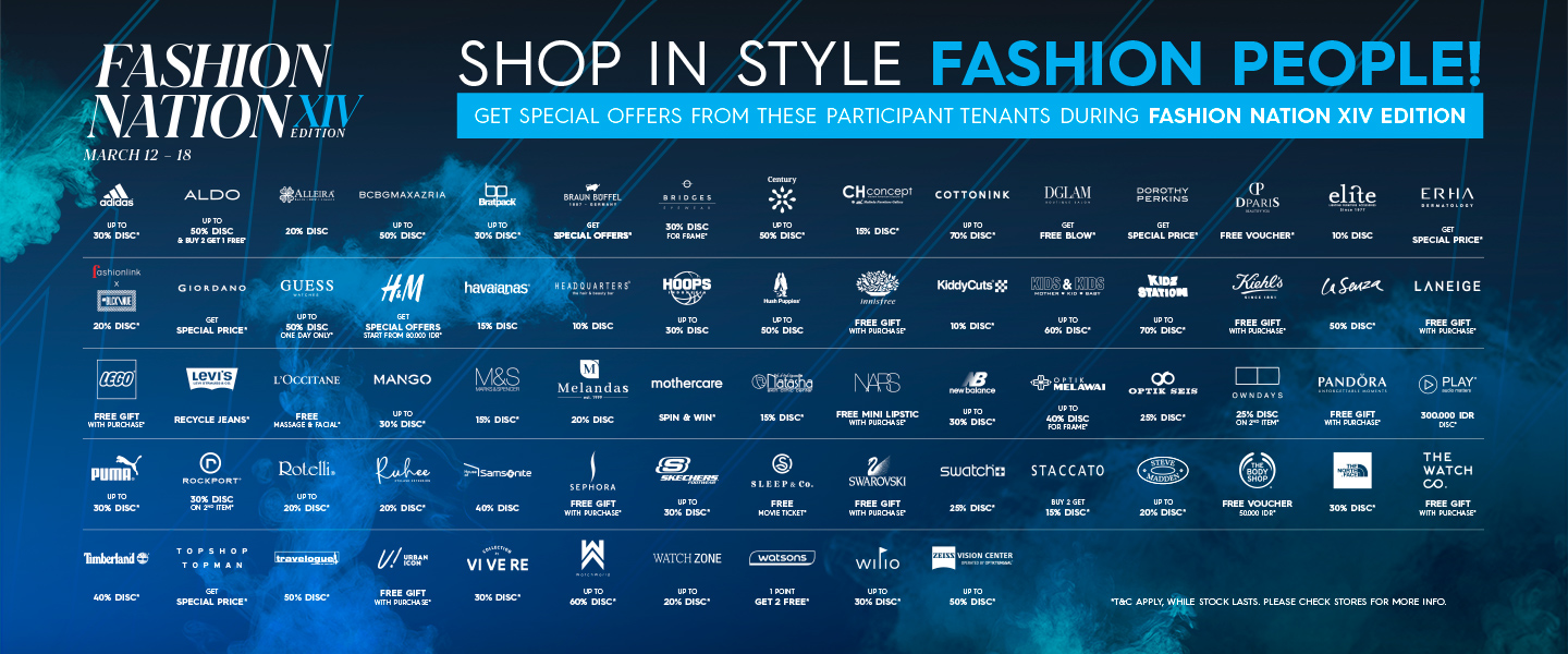 Show your Fashion Nation ID or invitation to enjoy special offers from these participants tenant during Fashion Nation XIV Edition.