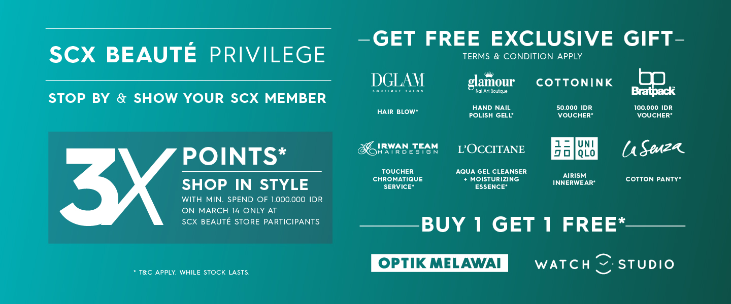 3. 3X POINTS for 50 SCX member pertama yang menukarkan struk pembelanjaan di tenant SCX Beaute Privilege hanya pada tanggal 14 Maret 2020 selama periode berlangsung dengan minimal pembelanjaan senilai Rp1.000.000,- (satu juta rupiah).