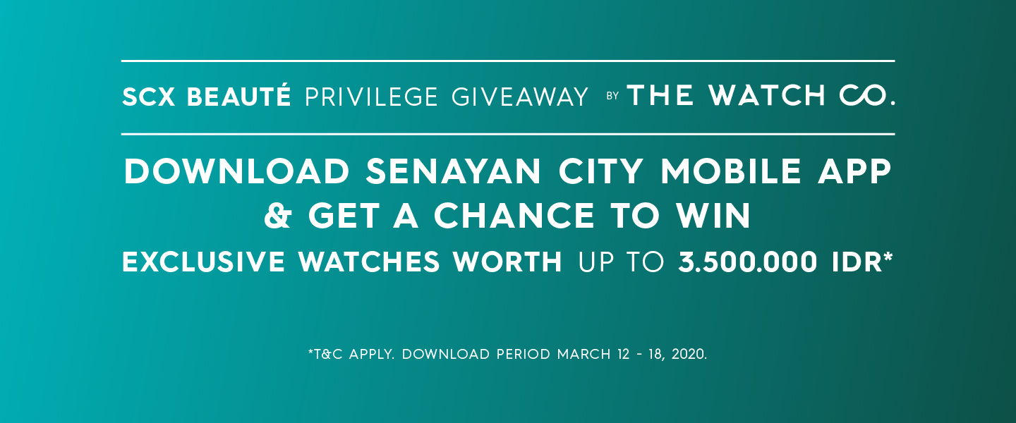 - New Downloader Senayan City Mobile App khusus pada tanggal 12 - 18 Maret 2020 selama periode berlangsung akan berkesempatan mendapatkan hadiah sesuai program. Dengan syarat dan ketentuan seperti dibawah ini: