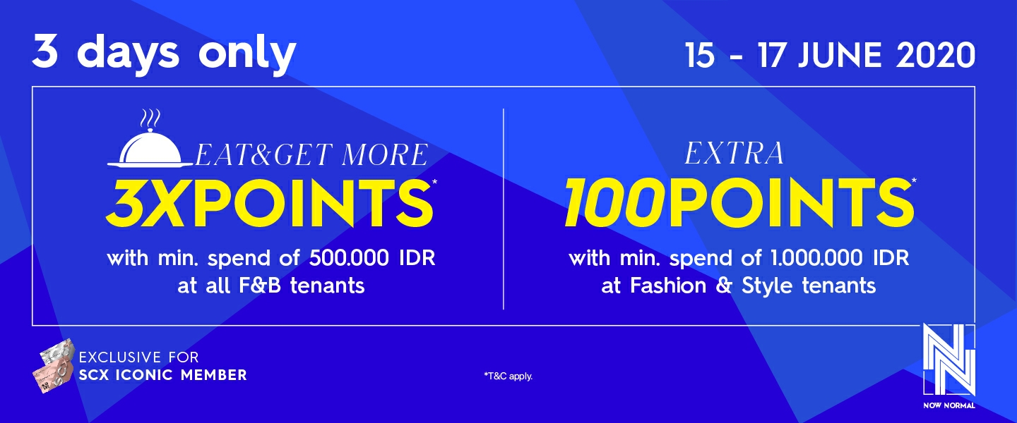 - 20 SCX Member pertama yang menukarkan struk pembelanjaan khusus di tenant F&B (kecuali di tenant – tenant bertanda*) pada tanggal 5 – 7 Juni 2020 selama periode berlangsung dengan minimal senilai Rp 500.000,- (lima ratus ribu rupiah) dan maksimum senilai Rp 5.000.000,- (lima juta rupiah) berkesempatan mendapatkan 3X POINTS.