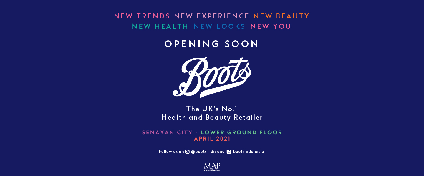 COMING SOON! The first Boots store in Indonesia will be soon available at Senayan City – Lower Ground Floor this April 2021! Follow @boots_idn so you won’t miss out on any information!
