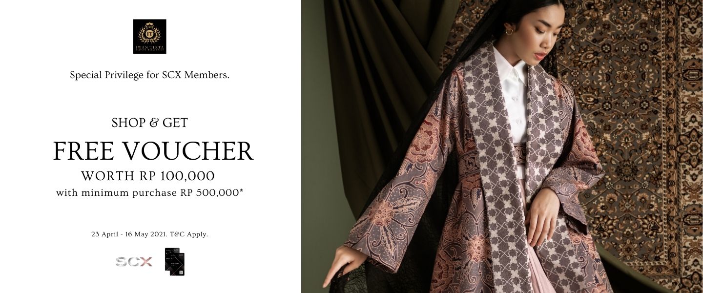 Shop & get free Senayan City E-voucher worth 100,000 IDR with minimum purchase 500,000 IDR at Iwan Tirta Private Collection gallery at Senayan City Level 2. 23 April – 16 May 2021.