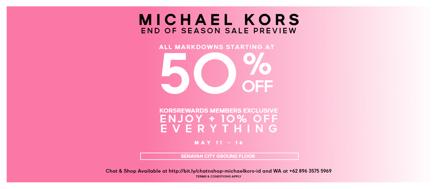 Markdowns start at 50% off + Add. 10% off, KORSREWARDS members exclusive, May 11–16. Visit store at Senayan City level GF.