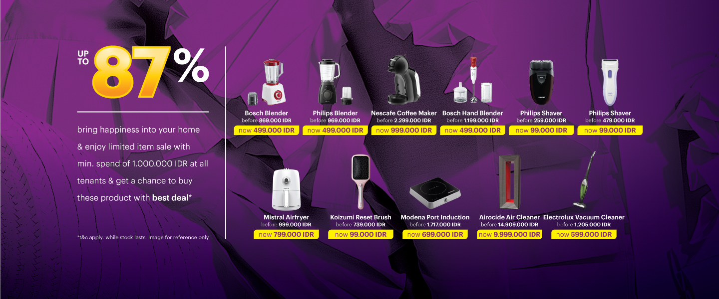 Bring happiness into your home and enjoy limited item sale up to 87% OFF with min. spend of 1.000.000 IDR at all tenants and get a chance to buy these product with BEST DEAL*