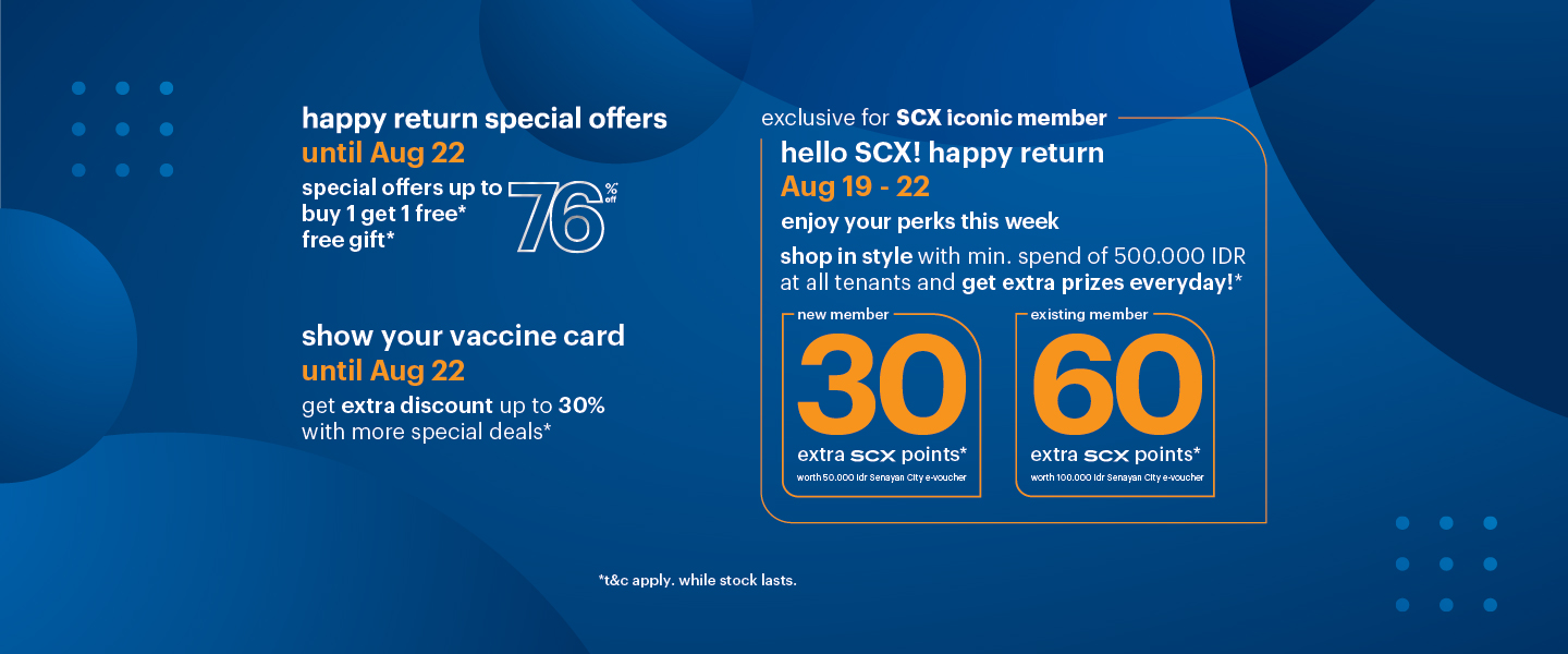 EXISTING MEMBER: Extra 60 SCX points (worth 100.000 IDR Senayan City E-Voucher)