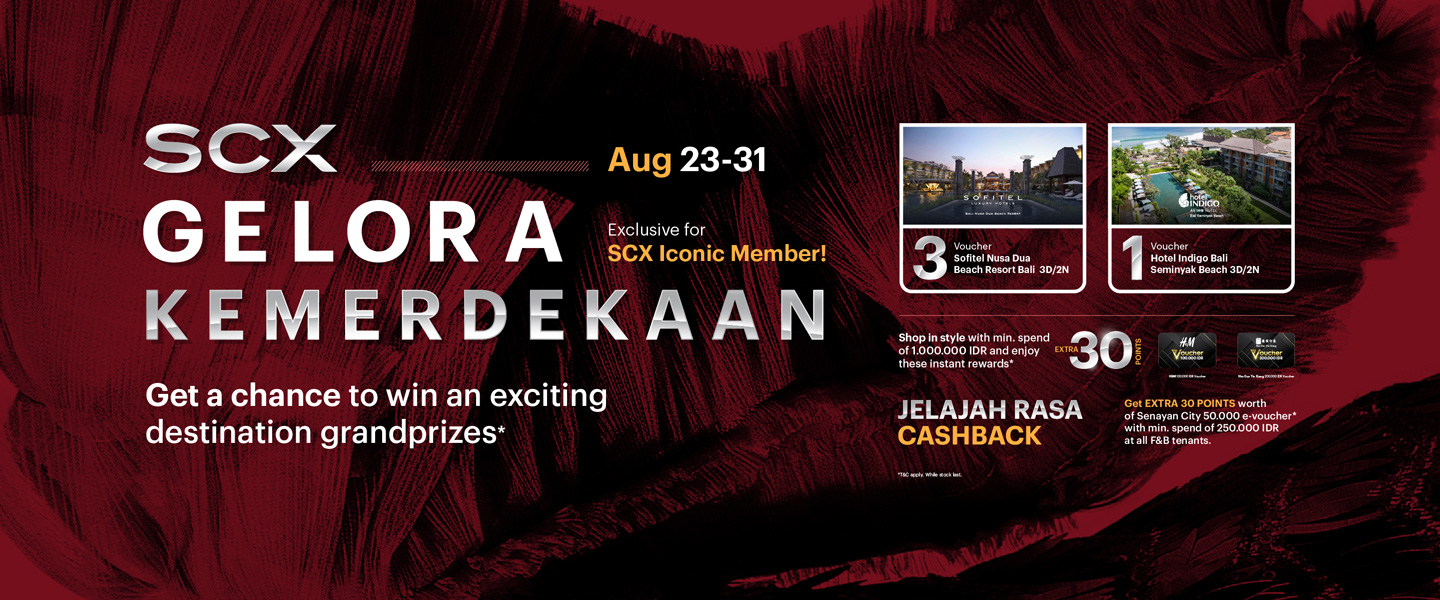 - 30 SCX Member pertama yang menukarkan struk pembelanjaan di semua tenant (kecuali tenant – tenant bertanda*) pada tanggal 23 – 31 Agustus 2021 selama periode berlangsung dengan minimal senilai Rp 1.000.000,- (satu juta rupiah) akan mendapatkan hadiah sesuai sistem.