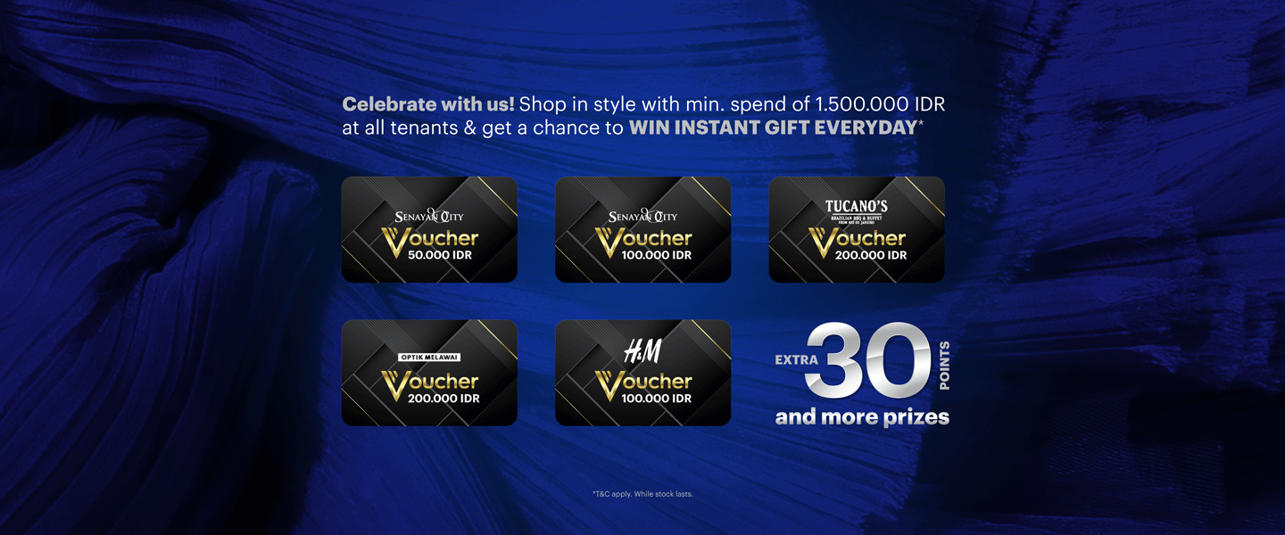 - Tidak berlaku untuk pembelanjaan atau pembelian di pameran diluar tenant Senayan City, penukaran valas, transaksi bank atau ATM, pembelian voucher belanja tenant, pembayaran telepon, membership tenant dan lainnya.