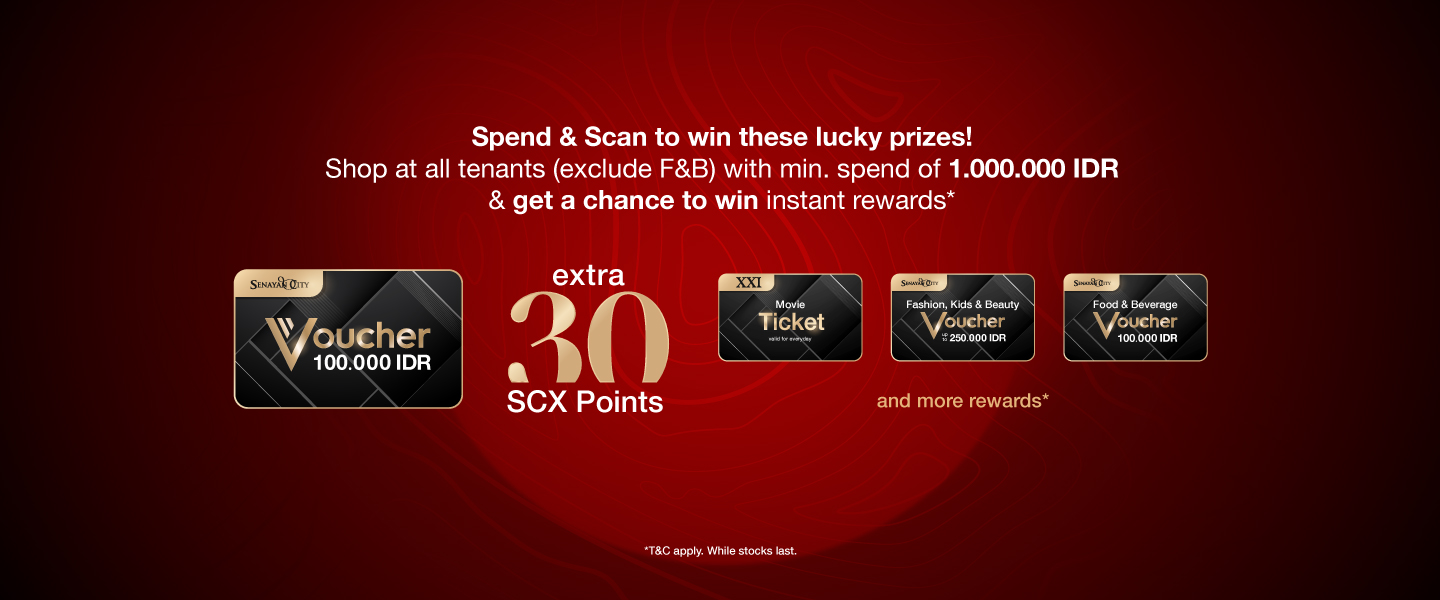 3. 50 SCX Member pertama yang menukarkan struk pembelanjaan di semua tenant (kecuali tenant – tenant bertanda*) dengan minimal senilai Rp 1.000.000,- (satu juta rupiah) selama periode berlangsung akan mendapatkan hadiah sesuai sistem.