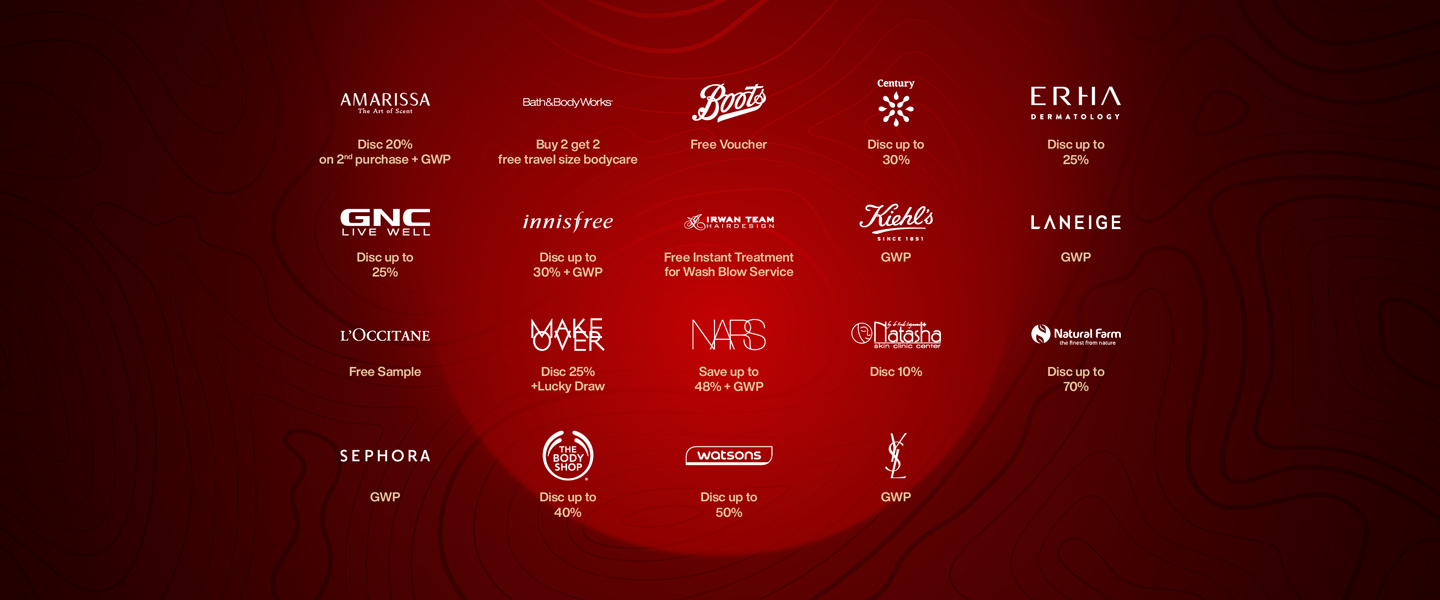 AMARISSA | BATH AND BODY WORKS | BOOTS | CENTURY | ERHA DERMATOLOGY | GNC LIVE WELL | INNISFREE | IRWAN TEAM | KIEHLS | LANEIGE | LOCCITANE | MAKE OVER | NARS | NATASHA | NATURAL FARM | SEPHORA | THE BODY SHOP | WATSONS | YSL BEAUTY