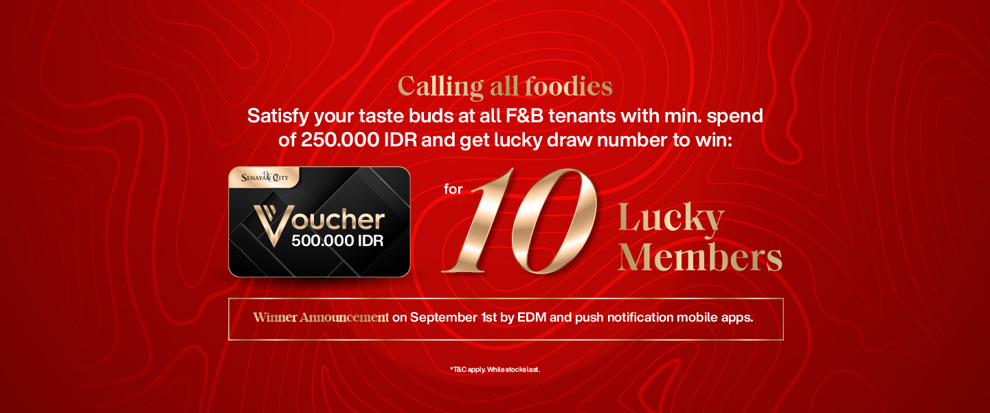 Satisfy your taste buds at all F&B tenants with min. spend of 250.000 IDR and get lucky draw number to WIN:
