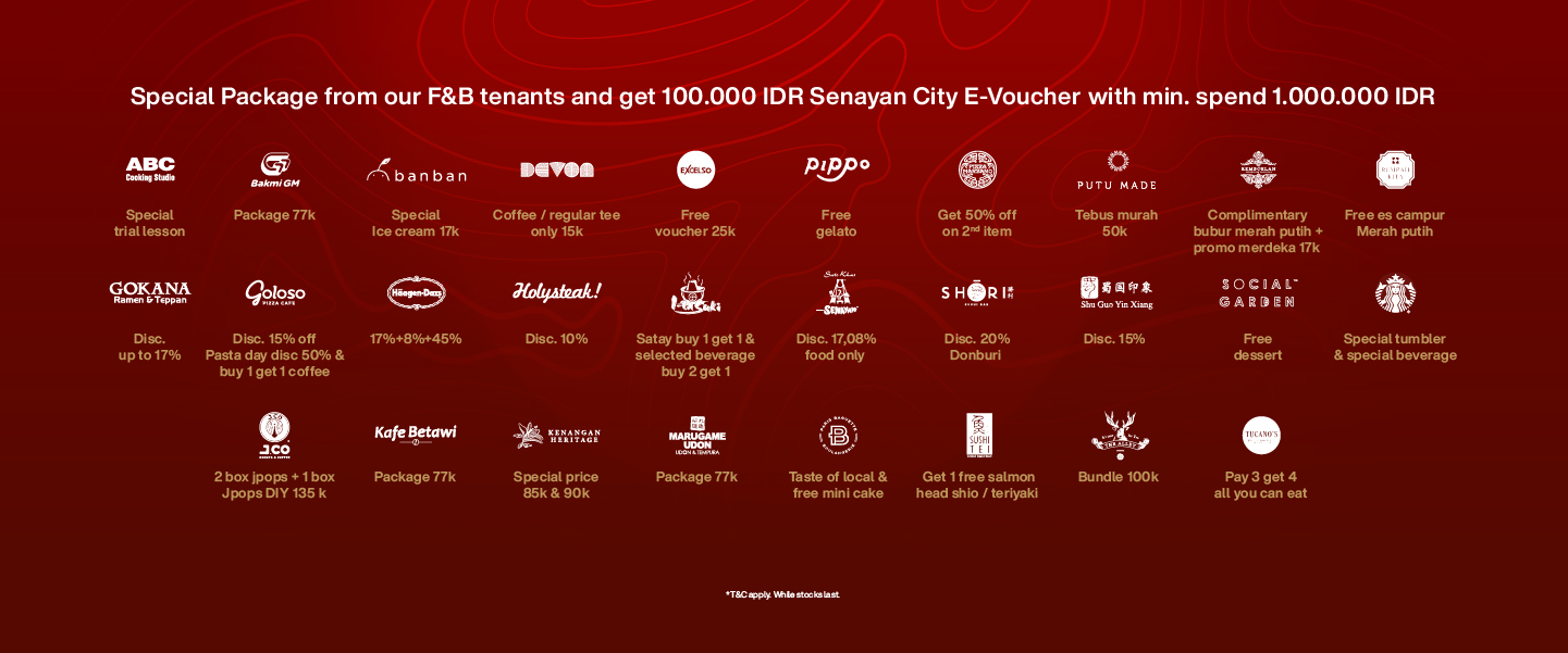 Special packages from our F&B tenants and get 100,000 IDR Senayan City E-Voucher with min. spend of 1,000,000 IDR.
