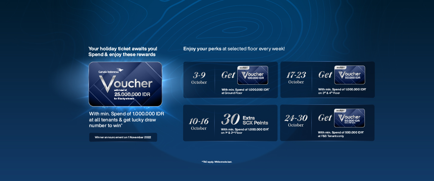 20 SCX Member yang menukarkan struk pembelanjaan di semua tenant F&B (kecuali tenant yang tertera pada ketentuan no.4) pada tanggal 24 – 30 Oktober 2022 selama periode berlangsung dengan minimal senilai Rp 500.000,- (lima ratus ribu rupiah) akan mendapatkan e-voucher Senayan City Rp 50.000,- (voucher berlaku hanya di tenant F&B).