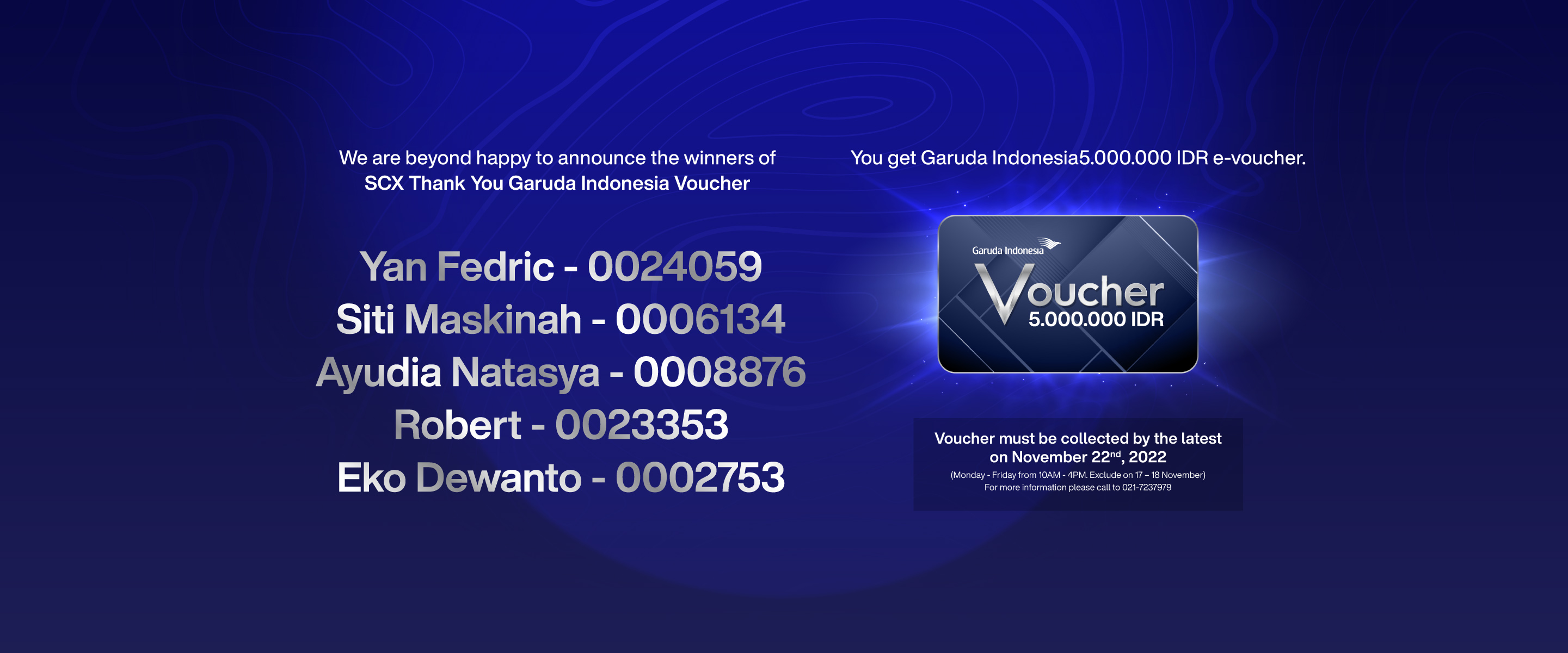 Congratulations! You’ve won Garuda Indonesia 5.000.000 IDR E-Voucher in our SCX THANK YOU Shopping Program.