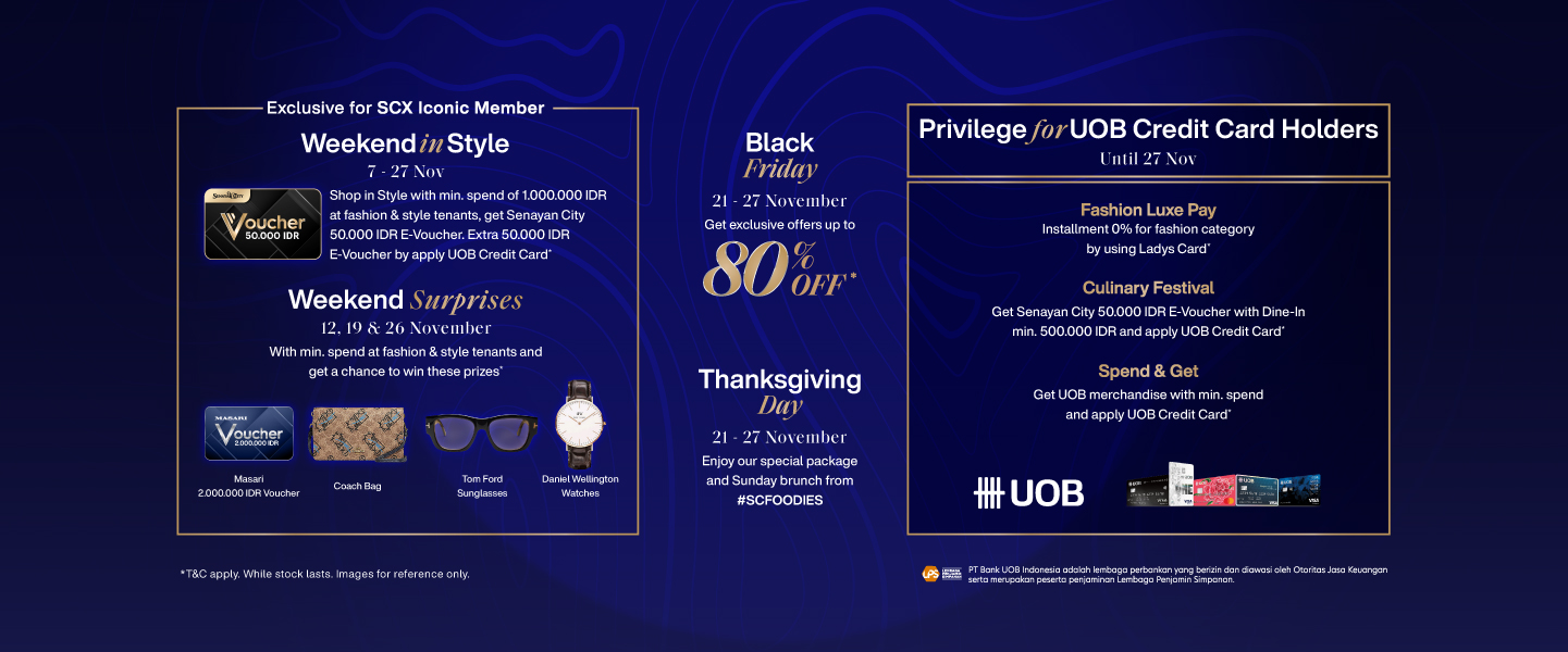 - Culinary Festival : Get Senayan City 50.000 IDR E-Voucher with Dine-In min. 500.000 IDR and apply UOB Credit Card*