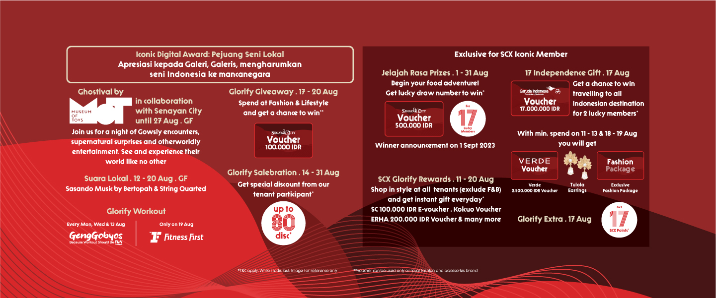 - Shop in style at all tenants (exclude F&B) and get instant gift everyday*. SC 100.000 IDR E-voucher. Kokuo Voucher, Erha 200.000 IDR Voucher & many more.