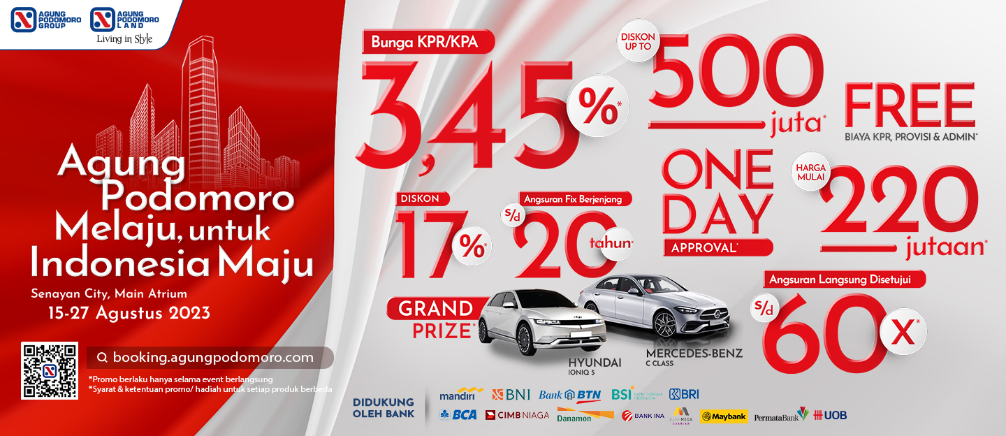 Acara ini menjadi momen istimewa karena Agung Podomoro akan mengungkap secara langsung proyek dan fasilitas terbarunya dari seluruh penjuru Indonesia, kepada para pelanggan setia. Dapatkan kemudahan memiliki hunian eksklusif dengan promo bunga KPR/KPA 3,45%, harga mulai dari 220jutaan, Diskon hingga 500juta, Grand Prize dan banyak promo menarik lainnya!