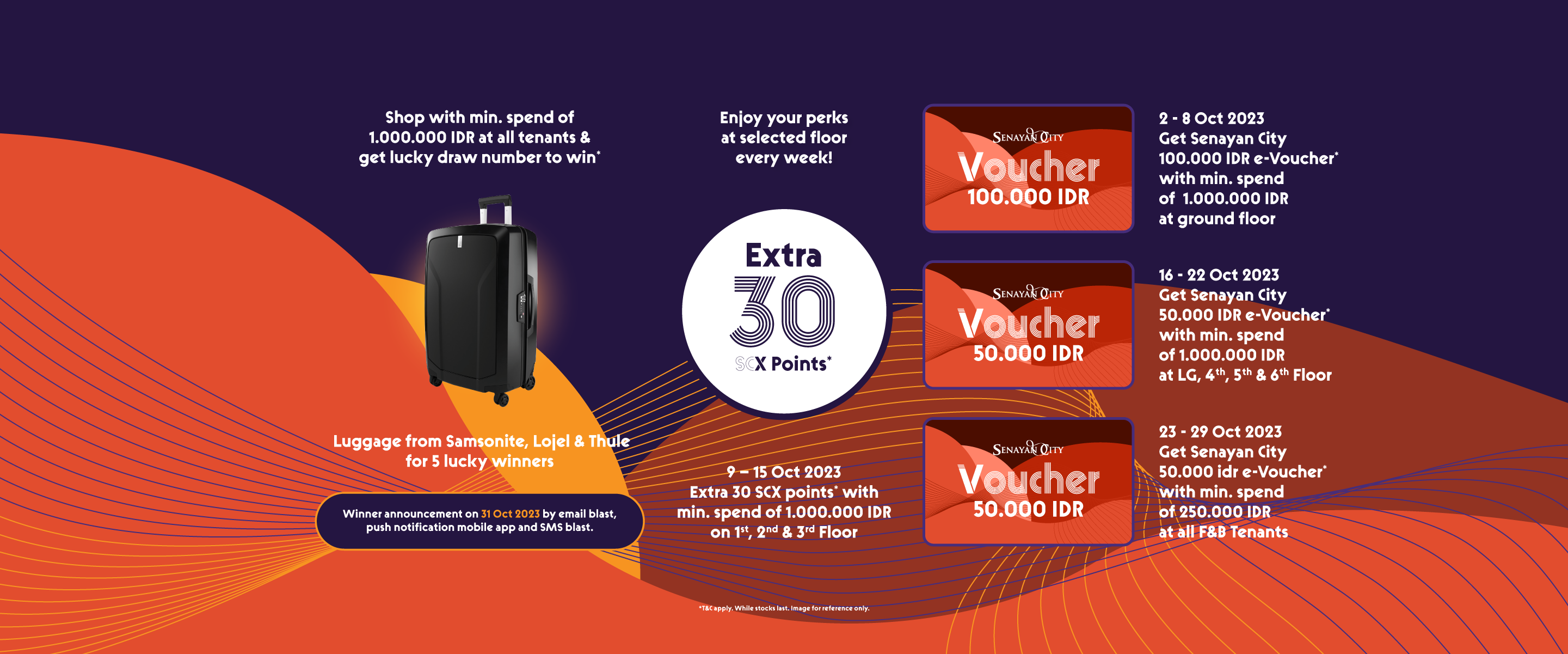 20 SCX Member yang menukarkan struk pembelanjaan di tenant khusus Lantai LG, 4, 5, dan 6 (kecuali tenant yang tertera pada ketentuan no.4) pada tanggal 16 – 22 Oktober 2023 selama periode berlangsung dengan minimal senilai Rp 1.000.000,- (satu juta rupiah) akan mendapatkan e-voucher Senayan City Rp 50.000,- yang berlaku hanya di lantai LG, 4, 5, dan 6.