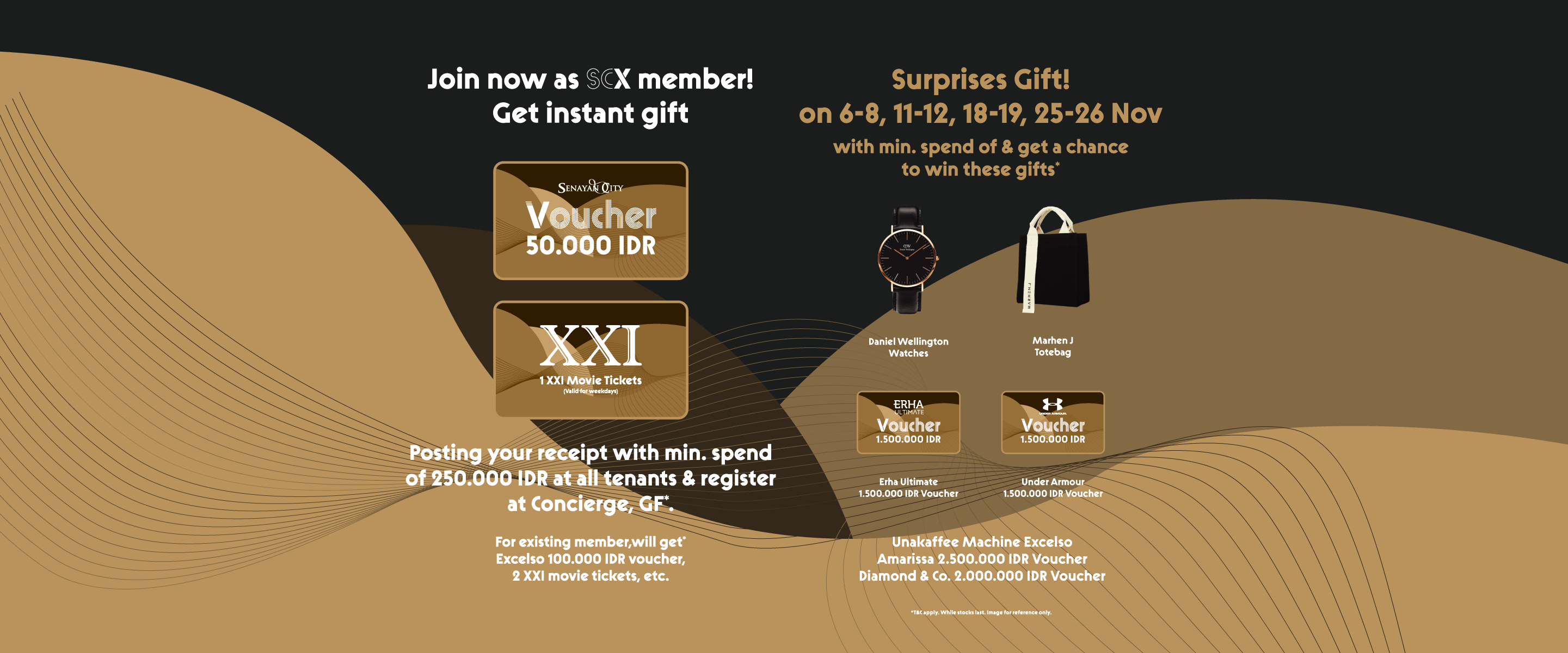 Posting your receipt with min. spend of 250.000 IDR at all tenants & register at Concierge, GF*