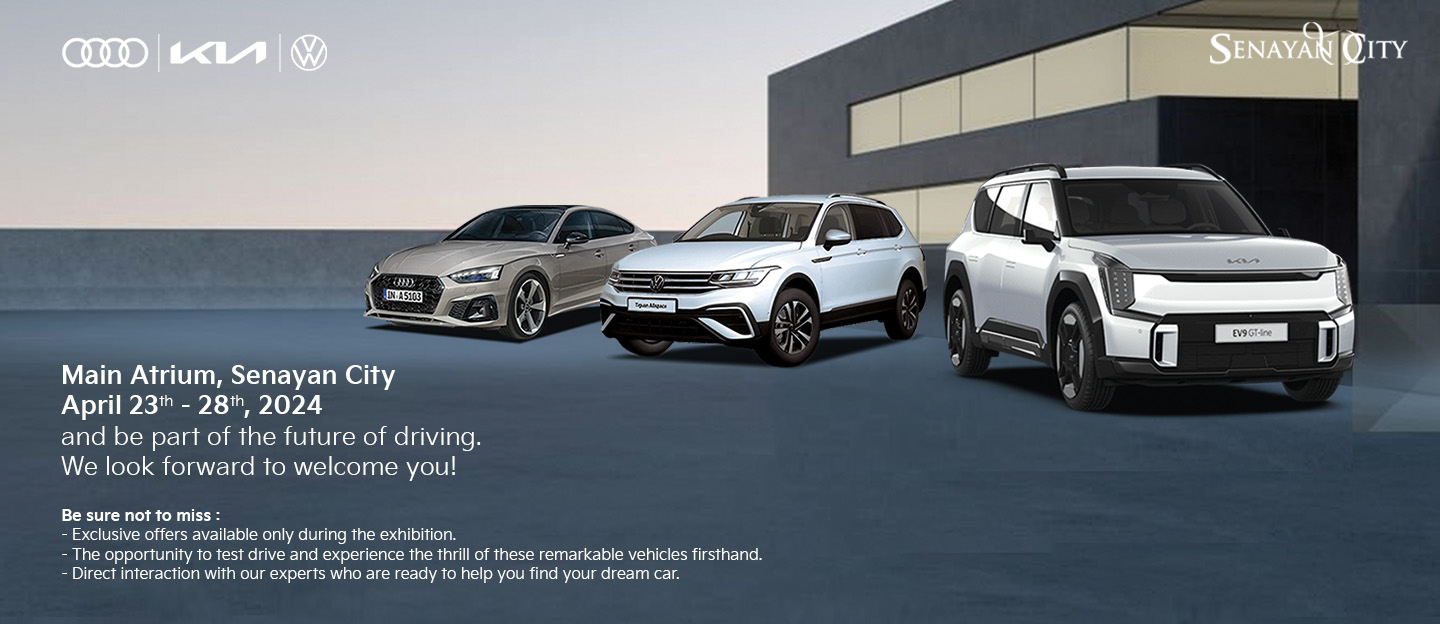 Kunjungi pameran Audi - KIA- Volkswagen di Main Atrium, Senayan City mulai tanggal 23 - 28 April 2024. Rasakan kenyamanan berkendara dengan unit test drive yang ada dan dapatkan promo spesial selama pameran berlangsung
