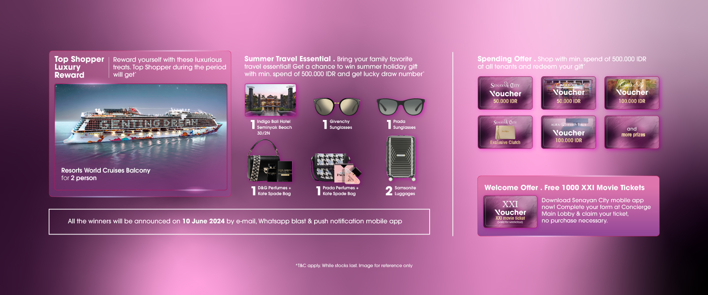 - Pemenang akan diundi oleh management dan akan diumumkan pada tanggal 10 Juni 2024 melalui Email Blast, SMS Blast, dan push notification mobile app Senayan City