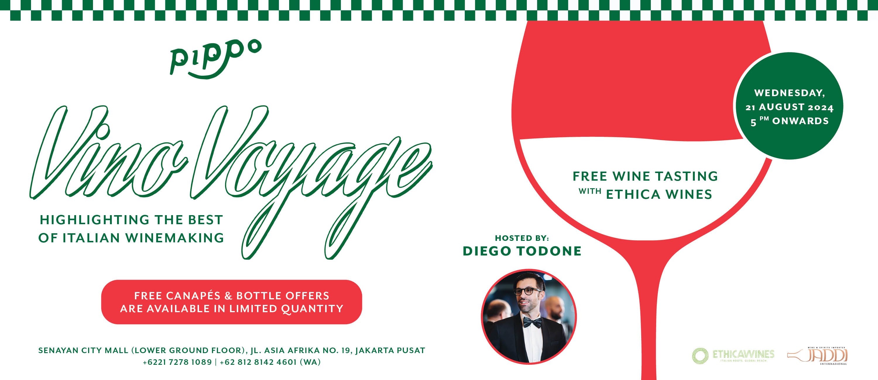 August brings back Vino Voyage to Pippo Italian! Join us on Wednesday, 21 August 2024 from 5 PM onwards for a complimentary wine tasting hosted by Diego Todone from Ethica Wines. Sample all the unique notes in red, white and sparkling varieties, available to purchase at a very special price until the end of the month.